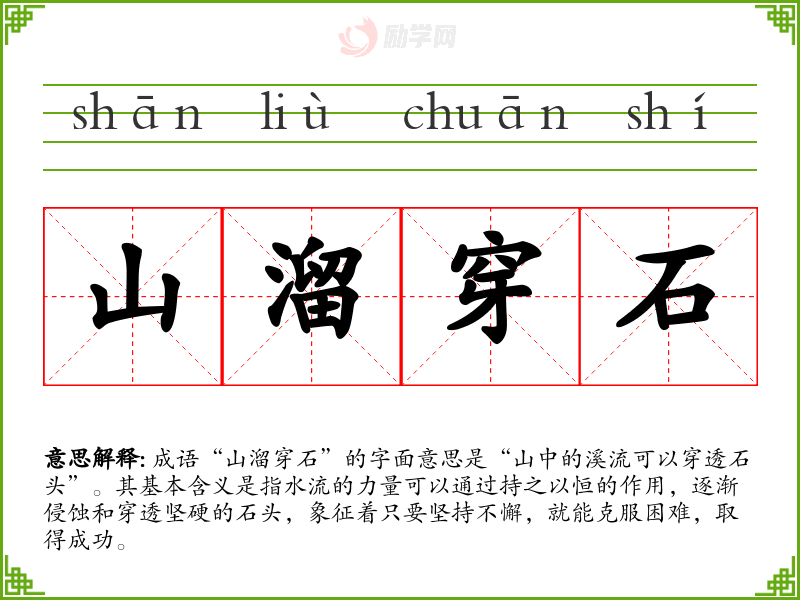 成语“山溜穿石”的字面意思是“山中的溪流可以穿透石头”。其基本含义是指水流的力量可以通过持之以恒的作用,逐渐侵蚀和穿透坚硬的石头,象征着只要坚持不懈,就能克服困难,取得成功。