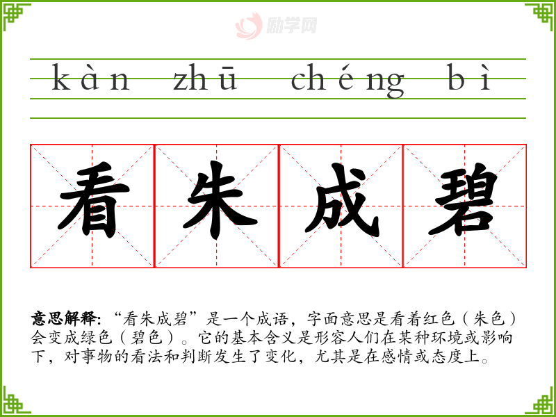 通过学*“看朱成碧”,我认识到情感和态度的变化是人生的一部分。这个成语不仅丰富了我的语言表达能力,也让我更好地理解了人际关系和自我认知的重要性。在生活中,我们应当灵活应对变化,保持开放的心态。