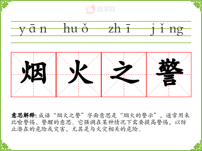 成语“烟火之警”字面意思是“烟火的警示”,通常用来比喻警惕、警醒的意思。它强调在某种情况下需要提高警惕,以防止潜在的危险或灾害,尤其是与火灾相关的危险。