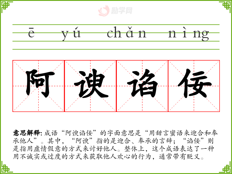 成语“阿谀谄佞”的字面意思是“用甜言蜜语来迎合和奉承他人”。其中,“阿谀”指的是迎合、奉承的言辞;“谄佞”则是指用虚情假意的方式来讨好他人。整体上,这个成语表达了一种用不诚实或过度的方式来获取他人欢心的行为,通常带有贬义。