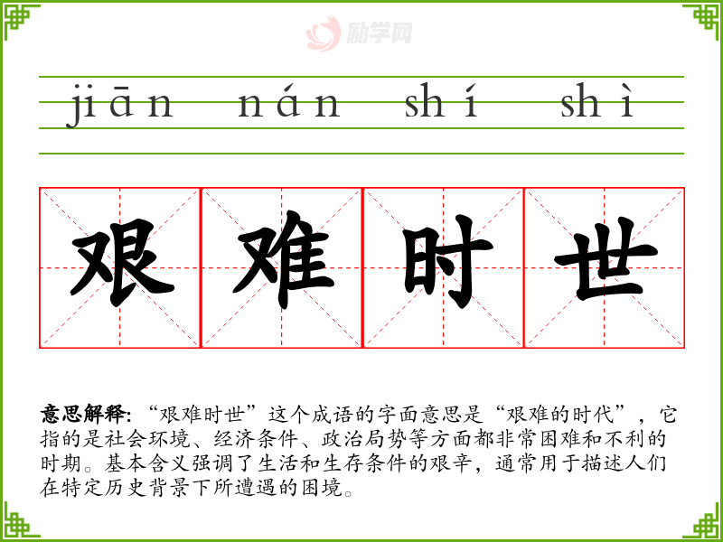 “艰难时世”这个成语的字面意思是“艰难的时代”,它指的是社会环境、经济条件、政治局势等方面都非常困难和不利的时期。基本含义强调了生活和生存条件的艰辛,通常用于描述人们在特定历史背景下所遭遇的困境。