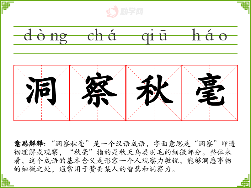通过对“洞察秋毫”的学,我认识到观察力和洞察力在我们的日常生活和工作中是多么的重要。它不仅能够帮助我们更好地理解周围的世界,还能增强我们的决策能力和解决问题的能力。在语言学和表达中,能够运用这样丰富的成语,能够使我们的交流更加生动、准确。