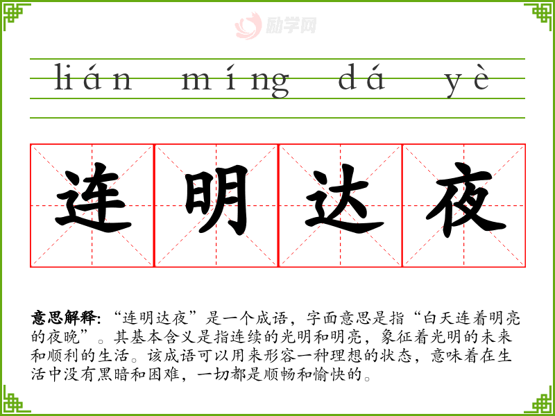 “连明达夜”是一个成语,字面意思是指“白天连着明亮的夜晚”。其基本含义是指连续的光明和明亮,象征着光明的未来和顺利的生活。该成语可以用来形容一种理想的状态,意味着在生活中没有黑暗和困难,一切都是顺畅和愉快的。