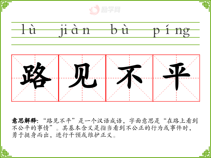 通过对“路见不平”的学,我认识到这个成语不仅仅是语言表达,更是道德观念的体现。在语言学中,它提醒我们关注社会现象,鼓励我们在日常生活中积极维护正义。这个成语在现代社会依然具有重要意义,激励着我们为他人发声、为正义奋斗。