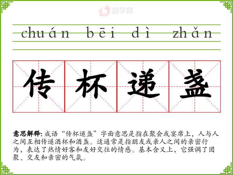通过对“传杯递盏”的学,我更深刻地理解了人与人之间交往的重要性和酒席文化的意义。这不仅丰富了我的语言表达,也让我在社交场合中更能把握气氛,增进友谊。这个成语在我的语言学和表达中起到了重要的作用,提醒我珍惜与人交往的时光。