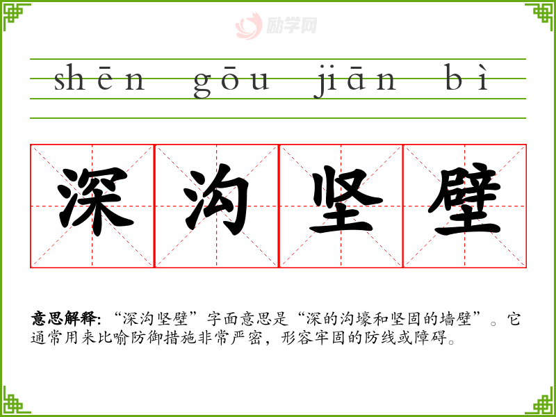 “深沟坚壁”字面意思是“深的沟壕和坚固的墙壁”。它通常用来比喻防御措施非常严密,形容牢固的防线或障碍。