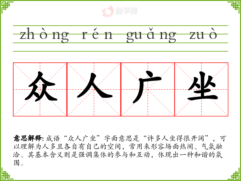 成语“众人广坐”字面意思是“许多人坐得很开阔”,可以理解为人多且各自有自己的空间,常用来形容场面热闹、气氛融洽。其基本含义则是强调集体的参与和互动,体现出一种和谐的氛围。