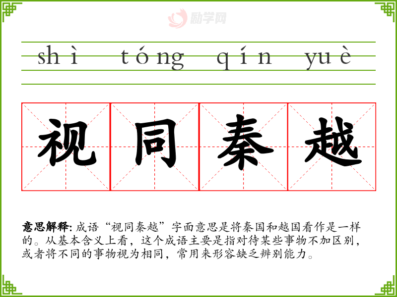 - 演讲:在正式场合,强调对事物的辨别能力时,可以提到“在处理复杂问题时,我们不能视同秦越。”