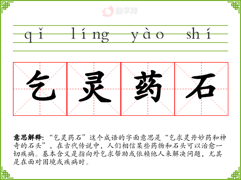 “乞灵药石”这个成语的字面意思是“乞求灵丹妙药和神奇的石头”,在古代传说中,人们相信某些药物和石头可以治愈一切疾病。基本含义是指向外乞求帮助或依赖他人来解决问题,尤其是在面对困境或疾病时。