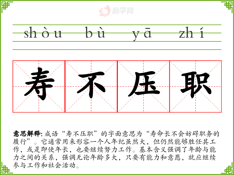 通过对“寿不压职”的学*,我深刻理解到年龄与能力并不成正比。这个成语不仅在语言表达上丰富了我的词汇,也让我在思维上更加宽容和开放。它在日常交流中使用频率较高,是对老年人能力的一种积极认可,值得我们在生活中频繁应用。