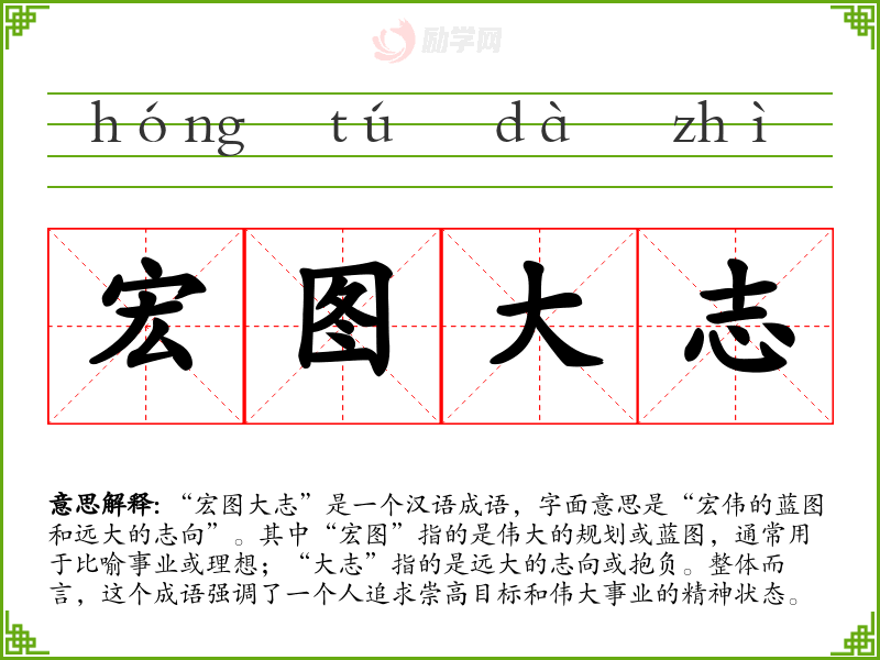 通过对“宏图大志”的深入理解,我认识到它不仅是一个成语,更是一种生活态度和价值观。在语言学*和表达中,能够灵活运用这样的成语,能够增强我的表达能力,同时也能激励我在生活中不断追求理想。