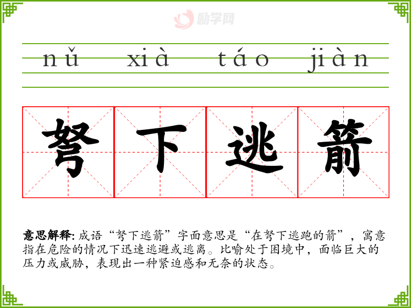 成语“弩下逃箭”字面意思是“在弩下逃跑的箭”,寓意指在危险的情况下迅速逃避或逃离。比喻处于困境中,面临巨大的压力或威胁,表现出一种紧迫感和无奈的状态。