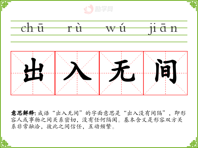 成语“出入无间”的字面意思是“出入没有间隔”,即形容人或事物之间关系密切,没有任何隔阂。基本含义是形容双方关系非常融洽,彼此之间信任,互动频繁。