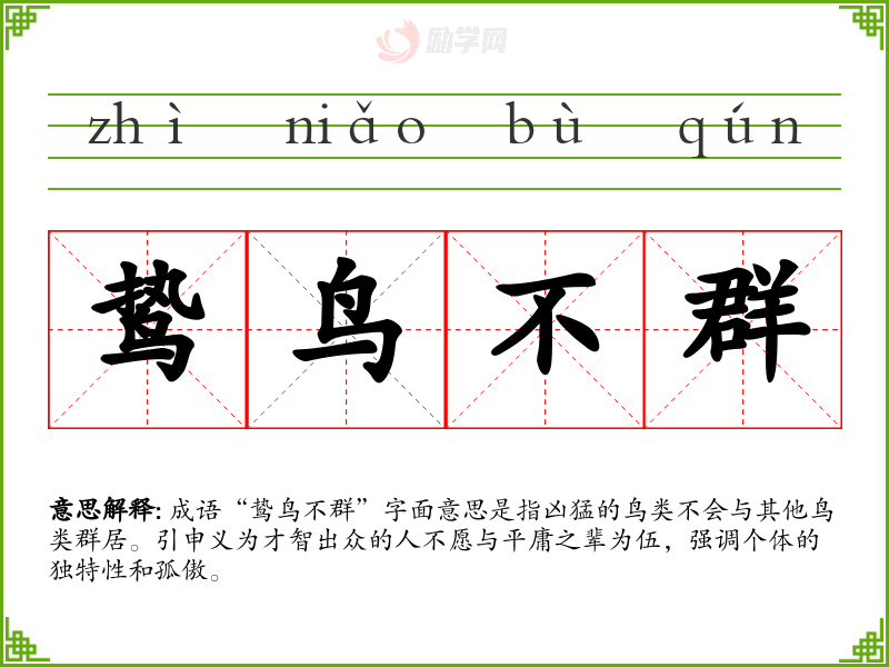 成语“鸷鸟不群”字面意思是指凶猛的鸟类不会与其他鸟类群居。引申义为才智出众的人不愿与平庸之辈为伍,强调个体的独特性和孤傲。