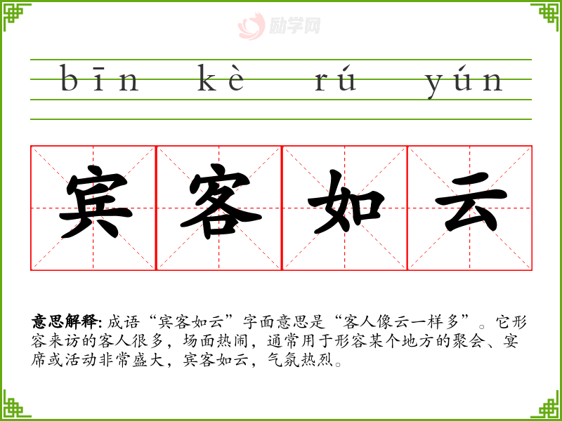 成语“宾客如云”字面意思是“客人像云一样多”。它形容来访的客人很多,场面热闹,通常用于形容某个地方的聚会、宴席或活动非常盛大,宾客如云,气氛热烈。