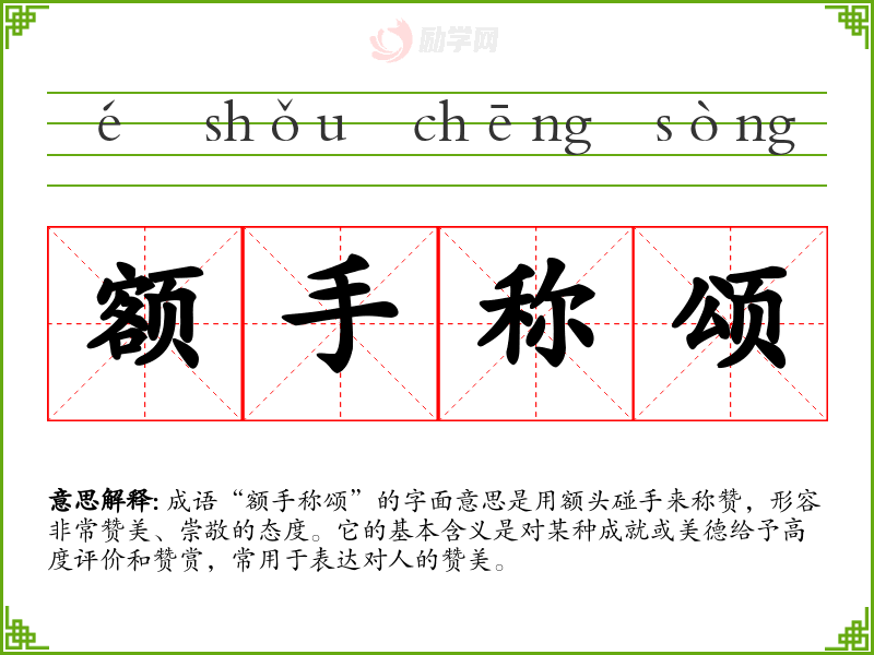 通过对“额手称颂”的学,我深刻理解到赞美的重要性,它不仅是对他人努力的认可,也是社会和谐的基石。这个成语在我今后的语言学与表达中,将激励我更加积极地运用赞美的方式与他人沟通。