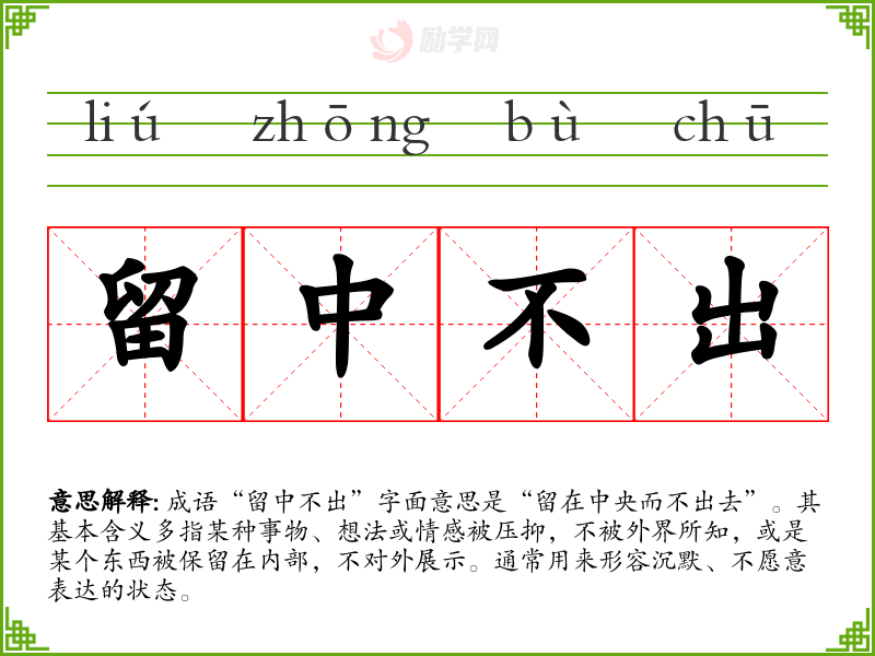 成语“留中不出”字面意思是“留在中央而不出去”。其基本含义多指某种事物、想法或情感被压抑,不被外界所知,或是某个东西被保留在内部,不对外展示。通常用来形容沉默、不愿意表达的状态。