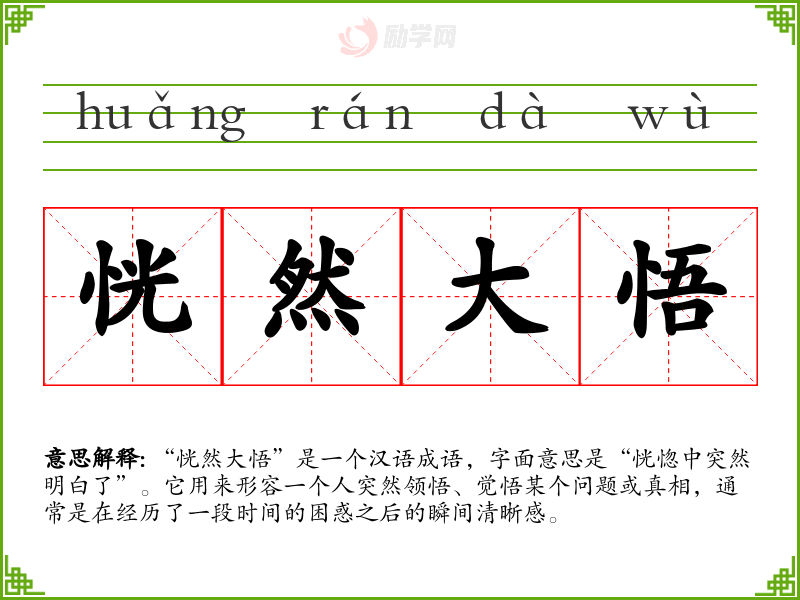 “恍然大悟”是一个汉语成语,字面意思是“恍惚中突然明白了”。它用来形容一个人突然领悟、觉悟某个问题或真相,通常是在经历了一段时间的困惑之后的瞬间清晰感。