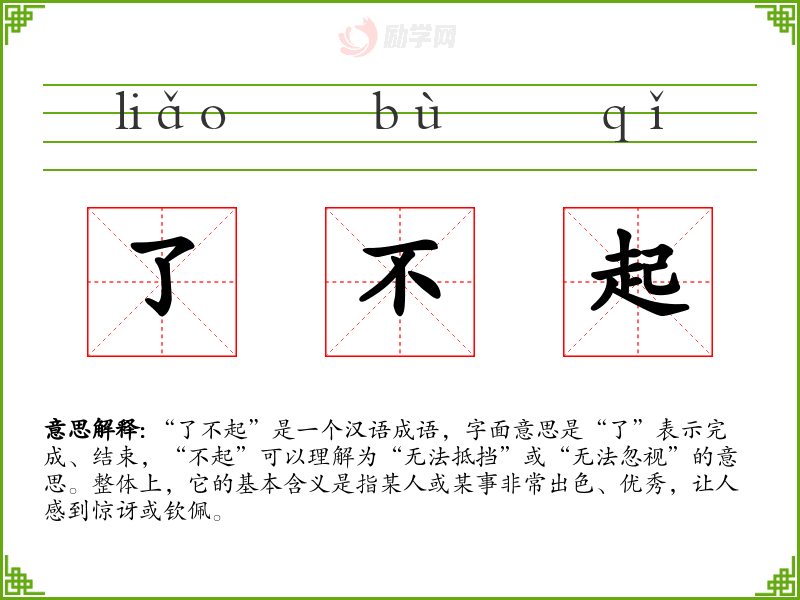 “了不起”是一个汉语成语,字面意思是“了”表示完成、结束,“不起”可以理解为“无法抵挡”或“无法忽视”的意思。整体上,它的基本含义是指某人或某事非常出色、优秀,让人感到惊讶或钦佩。