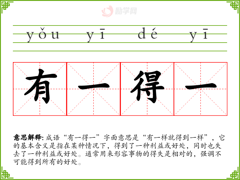 成语“有一得一”字面意思是“有一样就得到一样”,它的基本含义是指在某种情况下,得到了一种利益或好处,同时也失去了一种利益或好处。通常用来形容事物的得失是相对的,强调不可能得到所有的好处。