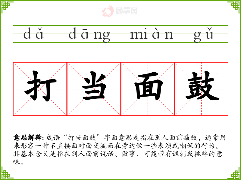 成语“打当面鼓”字面意思是指在别人面前敲鼓,通常用来形容一种不直接面对面交流而在旁边做一些表演或嘲讽的行为。其基本含义是指在别人面前说话、做事,可能带有讽刺或挑衅的意味。