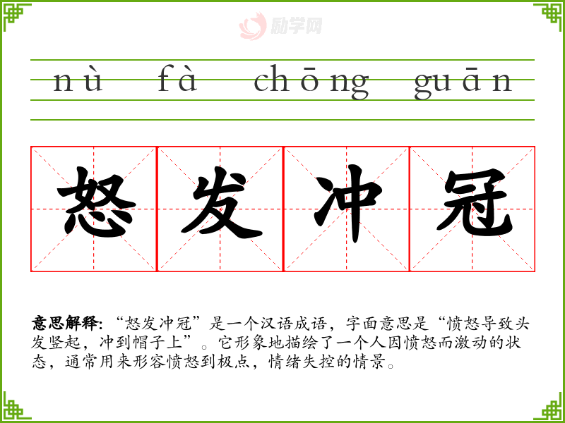 - 反义成语:心平气和、泰然自若。这些成语描述的是一种冷静的状态,正好与“怒发冲冠”的愤怒形成对比。