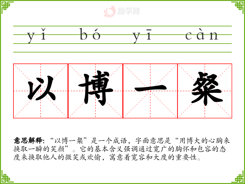 通过对“以博一粲”的学,我深刻认识到宽容和大度不仅是人际交往中的重要品质,也是个人修养的体现。在语言学与表达中,这一成语将帮助我更好地理解和表达情感,让交流更加顺畅和温暖。