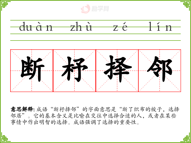 成语“断杼择邻”的字面意思是“断了织布的梭子,选择邻居”。它的基本含义是比喻在交往中选择合适的人,或者在某些事情中作出明智的选择。成语强调了选择的重要性。