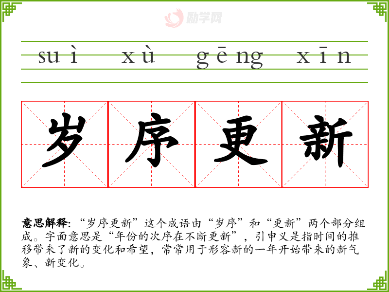 通过对“岁序更新”的学,我深刻体会到时间流逝不仅意味着旧的结束,也是新的开始。在语言学和表达中,理解并运用这样的成语,可以帮助我更好地传达积极的情感和思想,从而提升我的语言表达能力。
