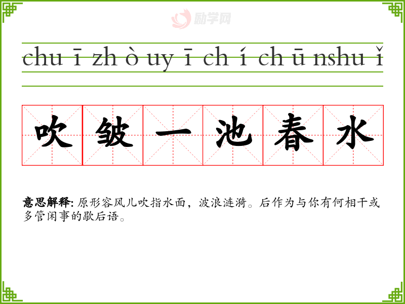 原形容风儿吹指水面,波浪涟漪。后作为与你有何相干或多管闲事的歇后语。