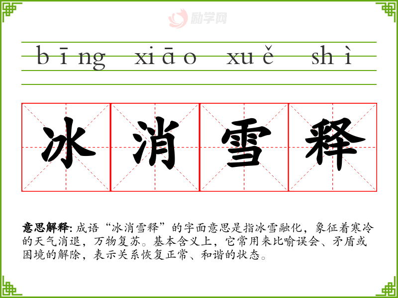 “冰消雪释”给人的情感反应通常是温暖和释然。它让我联想到人际关系中的宽容与理解,提醒我们在面对误会时要保持开放的心态。