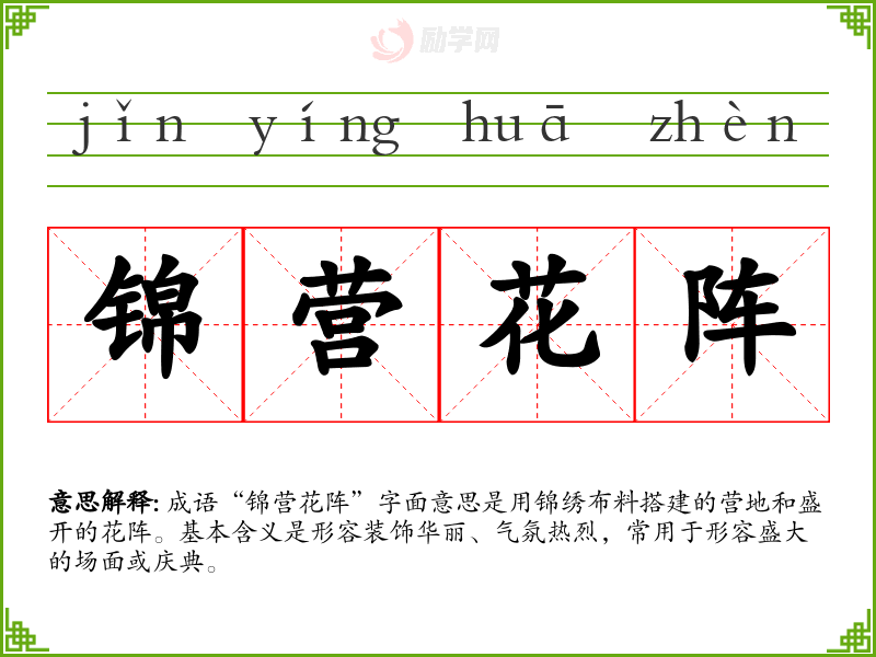 成语“锦营花阵”字面意思是用锦绣布料搭建的营地和盛开的花阵。基本含义是形容装饰华丽、气氛热烈,常用于形容盛大的场面或庆典。