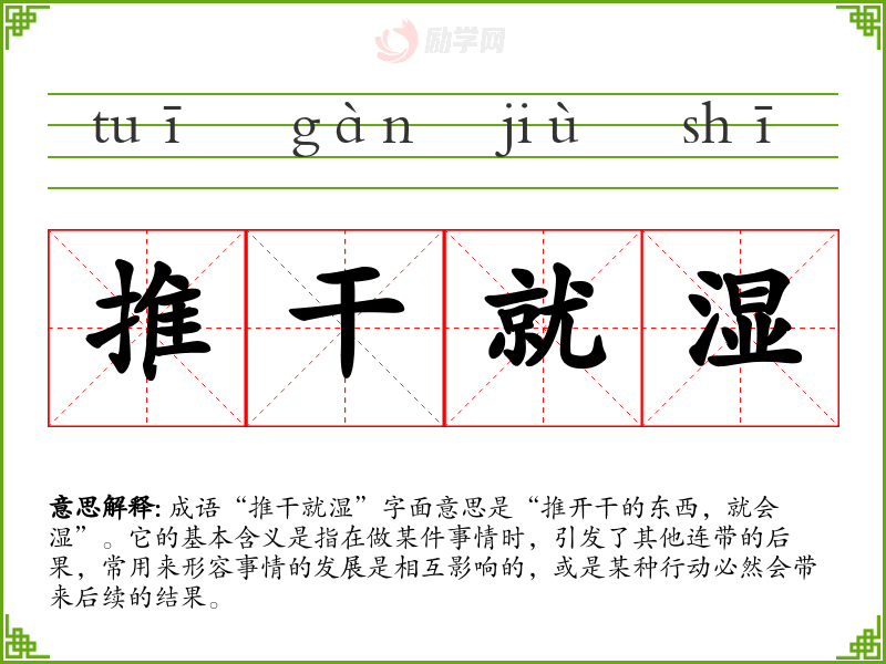 通过对“推干就湿”这个成语的学,我更加理解了因果关系在语言表达中的重要性。它不仅适用于日常交流,也能在更复杂的社会现象中找到其身影。在语言学中,掌握这种成语有助于提升我的表达能力和思维深度。