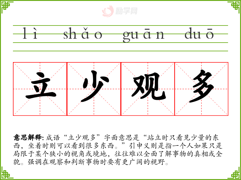 成语“立少观多”字面意思是“站立时只看见少量的东西,坐着时则可以看到很多东西。”引申义则是指一个人如果只是局限于某个狭小的视角或境地,往往难以全面了解事物的真相或全貌。强调在观察和判断事物时要有更广阔的视野。
