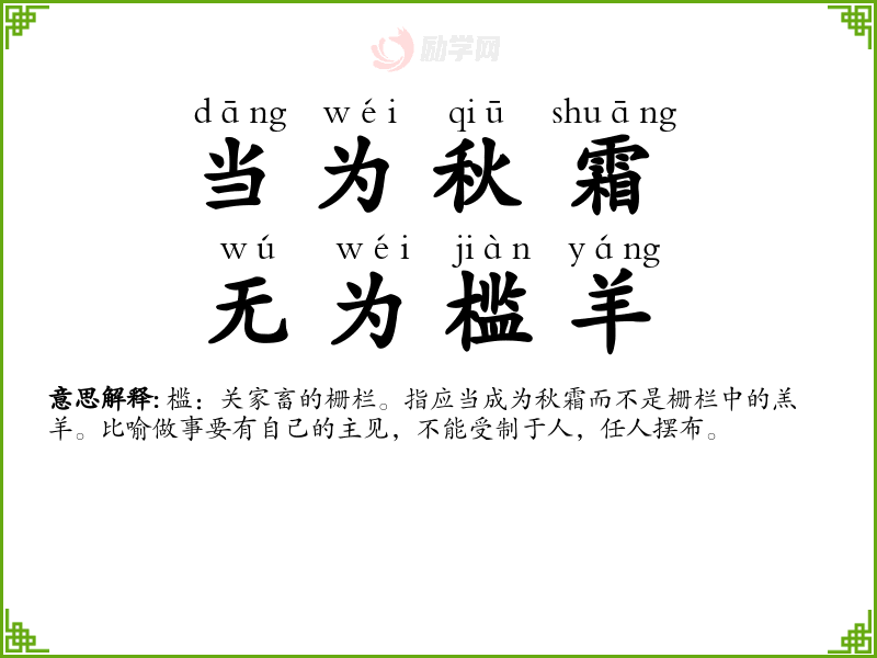 槛:关家畜的栅栏。指应当成为秋霜而不是栅栏中的羔羊。比喻做事要有自己的主见,不能受制于人,任人摆布。