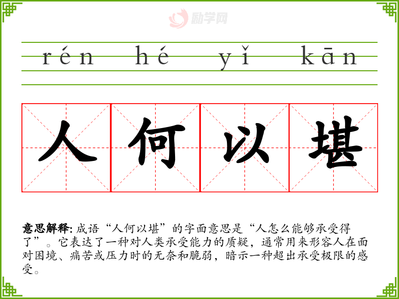 通过对“人何以堪”的学,我理解到这个成语不仅仅是对个人承受能力的质疑,更是一种对生活苦难的深刻反思。在语言学中,掌握这样的成语有助于更好地表达复杂的情感和思想,也增强了我对文学作品和社会现象的理解能力。