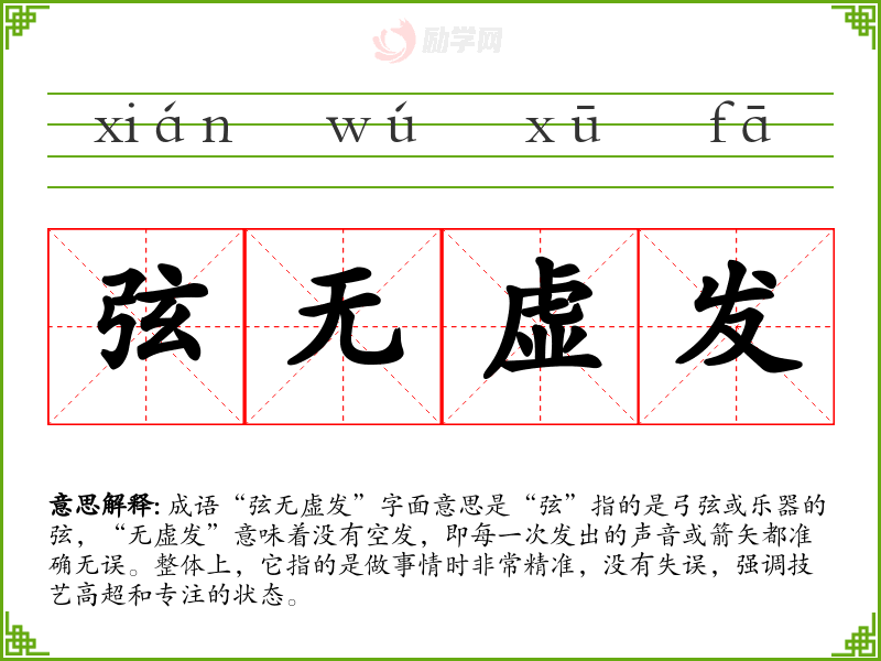 成语“弦无虚发”字面意思是“弦”指的是弓弦或乐器的弦,“无虚发”意味着没有空发,即每一次发出的声音或箭矢都准确无误。整体上,它指的是做事情时非常精准,没有失误,强调技艺高超和专注的状态。