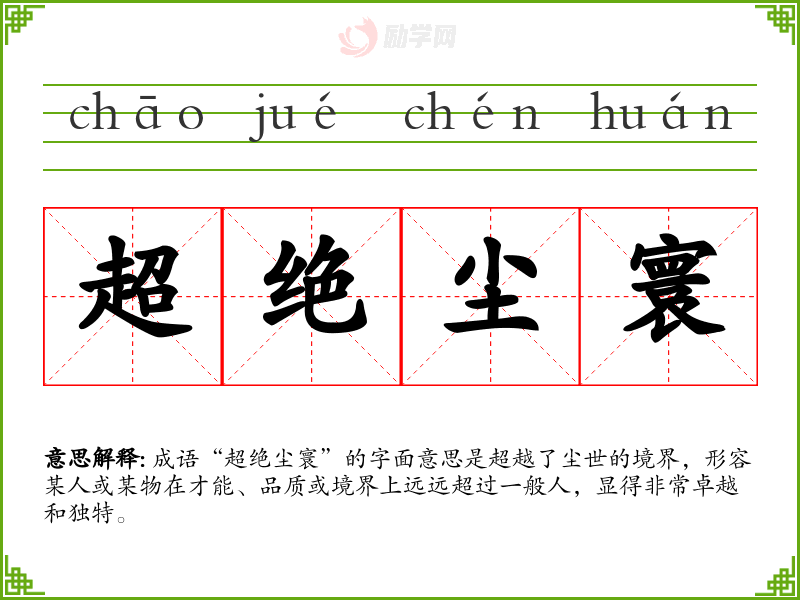 通过对“超绝尘寰”的学,我深刻理解到追求卓越、超越平凡的重要性。这不仅是语言学的一个环节,更是对个人理想和目标的激励。将来在表达时,我会更注意使用这样富有深意的成语,让我的语言更加生动和有力。