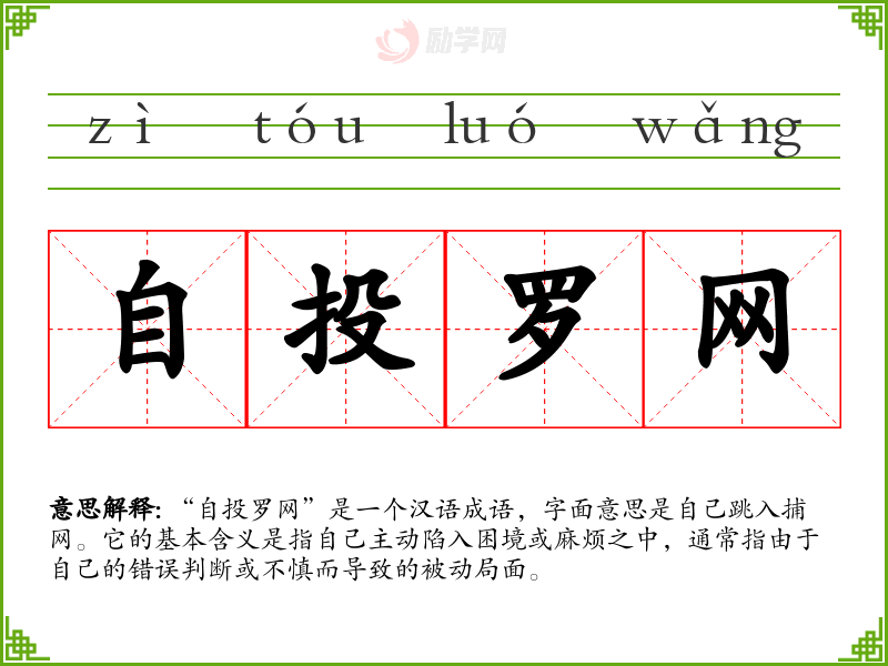 “自投罗网”是一个汉语成语,字面意思是自己跳入捕网。它的基本含义是指自己主动陷入困境或麻烦之中,通常指由于自己的错误判断或不慎而导致的被动局面。