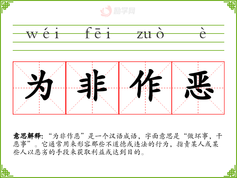 通过对“为非作恶”的学,我认识到其在社会中的警示作用和道德启发。它不仅是对恶行的指责,也是对善良的呼唤。在语言学和表达中,理解成语的深层含义能够帮助我更准确地表达思想,提升语言运用能力。