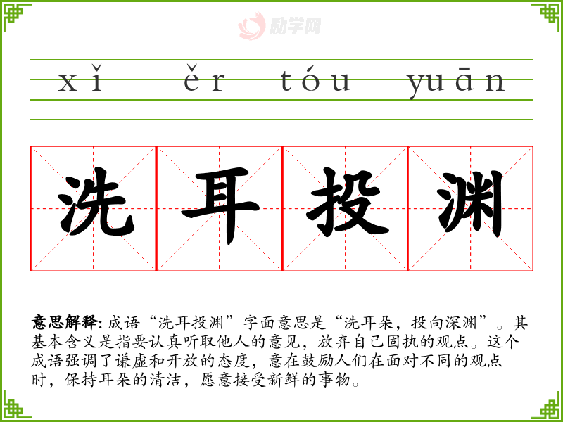成语“洗耳投渊”字面意思是“洗耳朵,投向深渊”。其基本含义是指要认真听取他人的意见,放弃自己固执的观点。这个成语强调了谦虚和开放的态度,意在鼓励人们在面对不同的观点时,保持耳朵的清洁,愿意接受新鲜的事物。