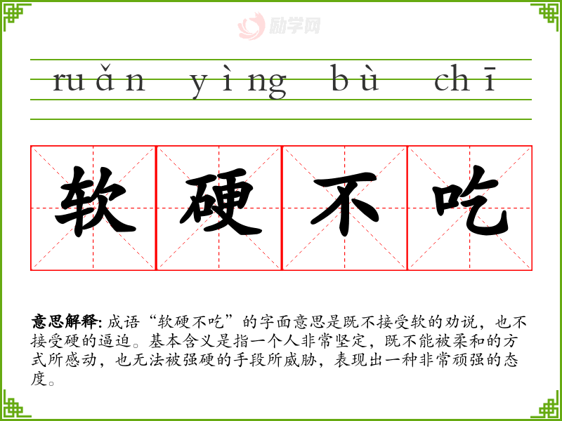 - 同义成语:顽固不化、坚定不移。这些成语都强调了人物的坚定态度,但“软硬不吃”更强调不受外部影响。