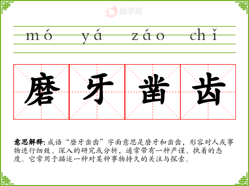 成语“磨牙凿齿”字面意思是磨牙和凿齿,形容对人或事物进行细致、深入的研究或分析,通常带有一种严谨、执着的态度。它常用于描述一种对某种事物持久的关注与探索。