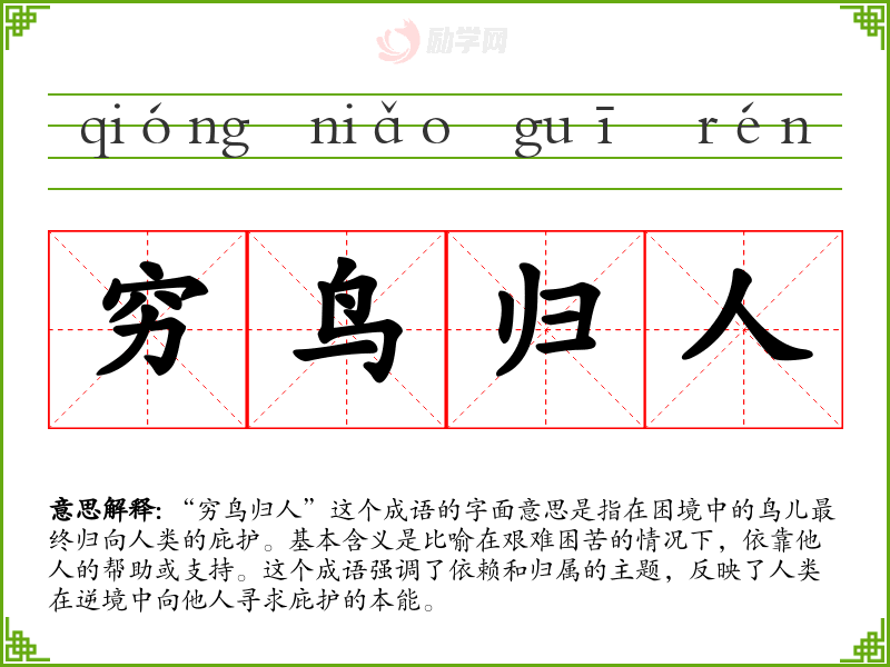 通过对“穷鸟归人”的学,我深刻体会到在生活中人际关系的重要性和相互支持的必要性。这一成语在我的语言学与表达中极具价值,它提醒我在面对困难时,勇于寻求帮助,并且在他人需要时,伸出援手。