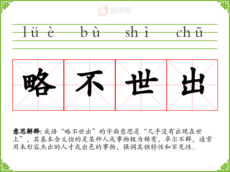 成语“略不世出”的字面意思是“几乎没有出现在世上”,其基本含义指的是某种人或事物极为稀有,卓尔不群,通常用来形容杰出的人才或出色的事物,强调其独特性和罕见性。