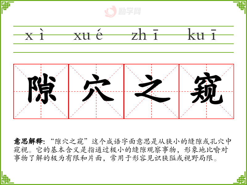 通过对“隙穴之窥”的学,我深刻认识到在日常生活和学中全面理解的重要性。这个成语不仅丰富了我的语言表达,也提醒我在面对问题时要保持开放的心态,努力从多个角度去看待事物,以免陷入片面的理解。