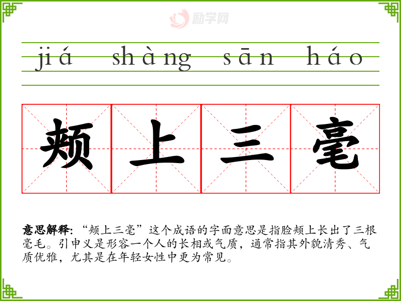 “颊上三毫”这个成语的字面意思是指脸颊上长出了三根毫毛。引申义是形容一个人的长相或气质,通常指其外貌清秀、气质优雅,尤其是在年轻女性中更为常见。