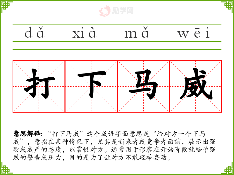 “打下马威”这个成语字面意思是“给对方一个下马威”,意指在某种情况下,尤其是新来者或竞争者面前,展示出强硬或威严的态度,以震慑对方。通常用于形容在开始阶段就给予强烈的警告或压力,目的是为了让对方不敢轻举妄动。