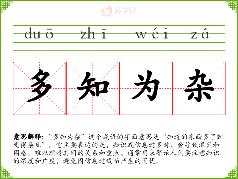 “多知为杂”这个成语的字面意思是“知道的东西多了就变得杂乱”。它主要表达的是,知识或信息过多时,会导致混乱和困惑,难以理清其间的关系和重点。通常用来警示人们要注意知识的深度和广度,避免因信息过载而产生的困扰。