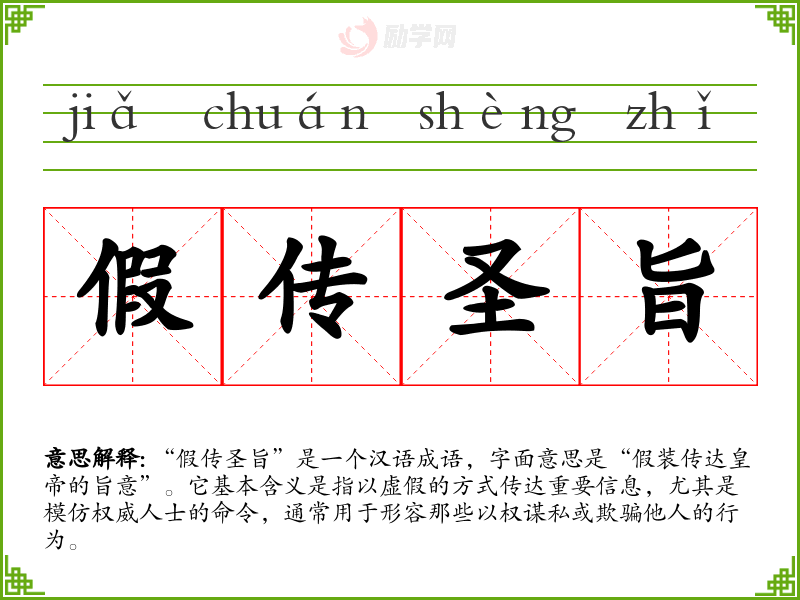 通过对“假传圣旨”的学,我深刻理解了信息传播的重要性以及对权威的尊重。在语言学和表达中,这个成语提醒我在交流时要注重真实和准确,避免误导他人。同时,它也激发了我对诚信与道德的思考,成为我日常沟通中的一个警示。